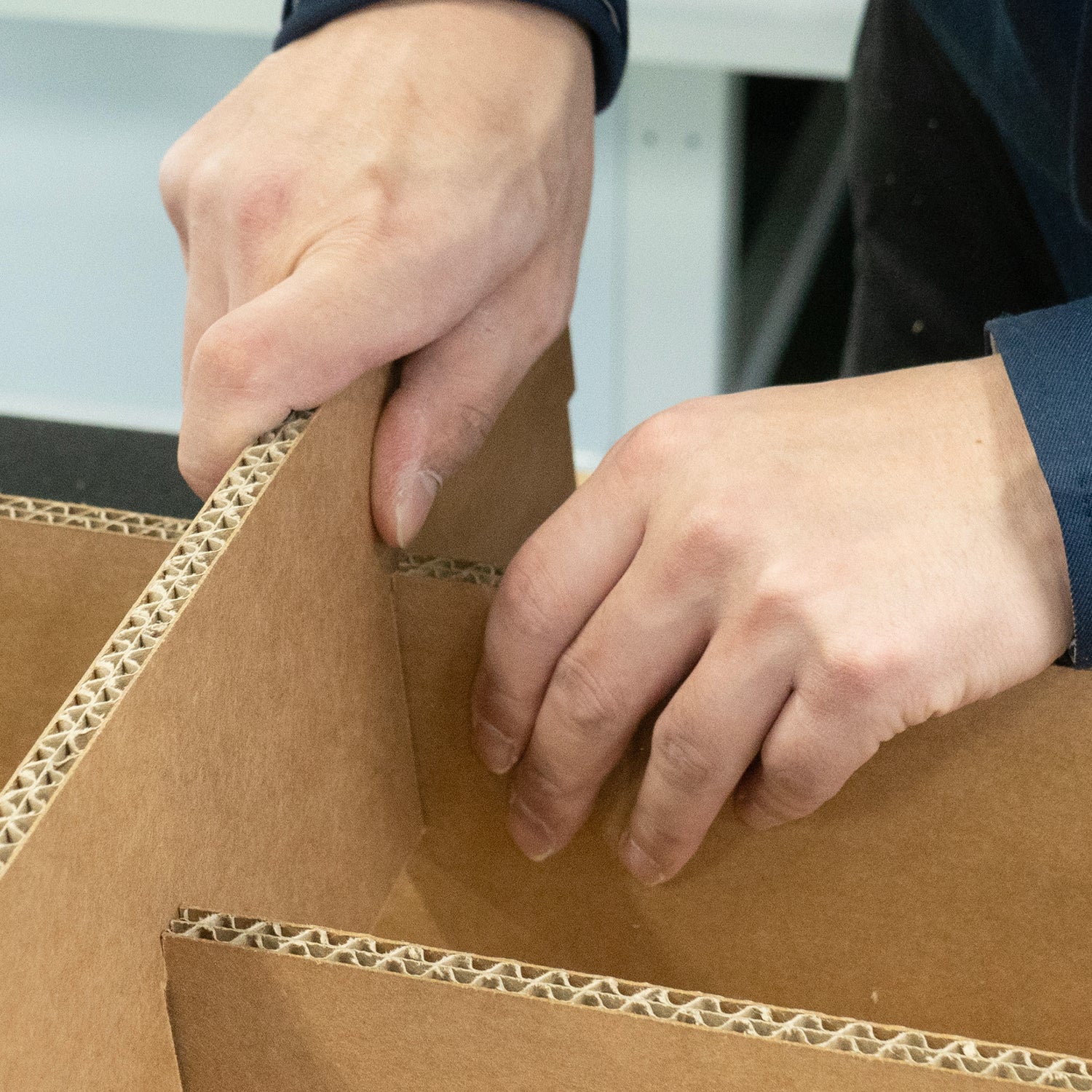 強化ダンボールの表面は、ニスなどのコーティングをしておらず、また無漂白の、環境にやさしい無垢な素材です。