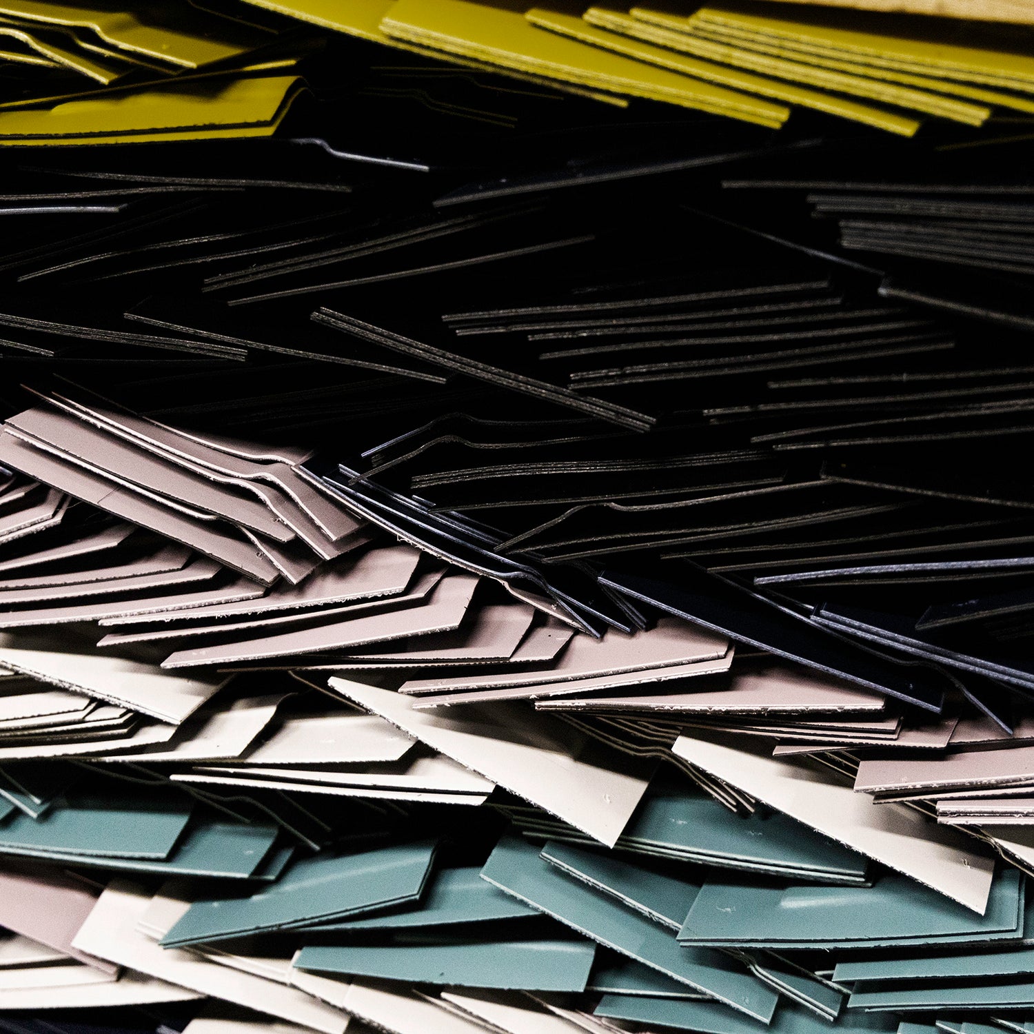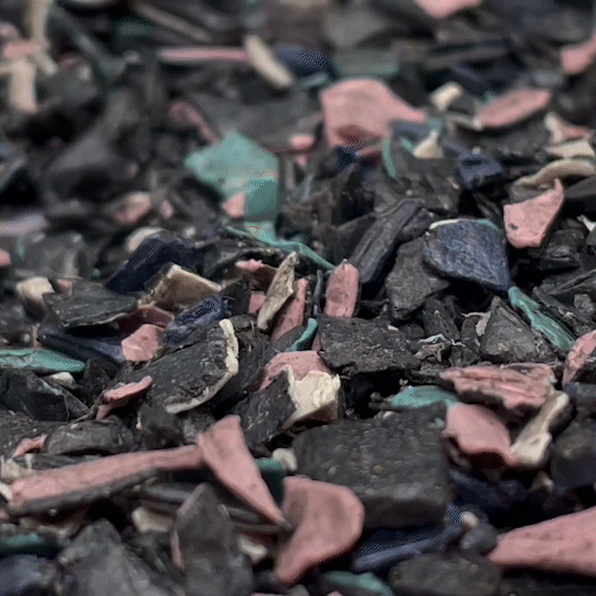 本体シェルの端材を粉砕。さらに細かく粉砕されたシェル端材は、再び板状にし、新しいスーツケースへと生まれ変わらせます。
